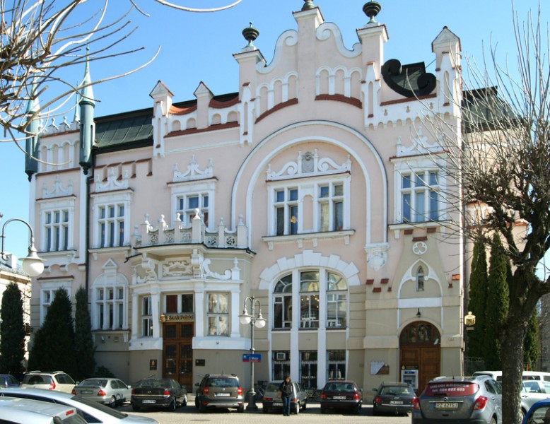 Bank Austriacko-Wegierski - centralny bank emisyjny Monarchii Austro-Węgierskiej został zbudowany w 1907 r. wg projektu z 1905 r. autorstwa krakowskiego architekta Teodora Hoffmanna. W 1938 r. został nieco przebudowany przez Kazimierza Michalskiego. Jest to wolnostojący, dwukondygnacyjny budynek wzniesiony na rzucie podkowy, nakryty czterospadowym dachem, pośrodku nad zryzalitowaną częścią – poprzecznym dachem mansardowym. Elewacja frontowa o neoklasycystycznym detalu ozdobiona jest boniowaniem, pilastrami środkowej, zryzalitowanej części i zamknięta od góry balustradą. W ukształtowaniu wnętrza widoczne są już modernistyczne wpływy. Uwagę zwracają - geometryczny układ płycin, wielka sala wsparta na dwu kolumnach o głowicach ozdobionych pękami liści papirusu, hall wejściowy z okładziną z zielonego sztucznego marmuru.