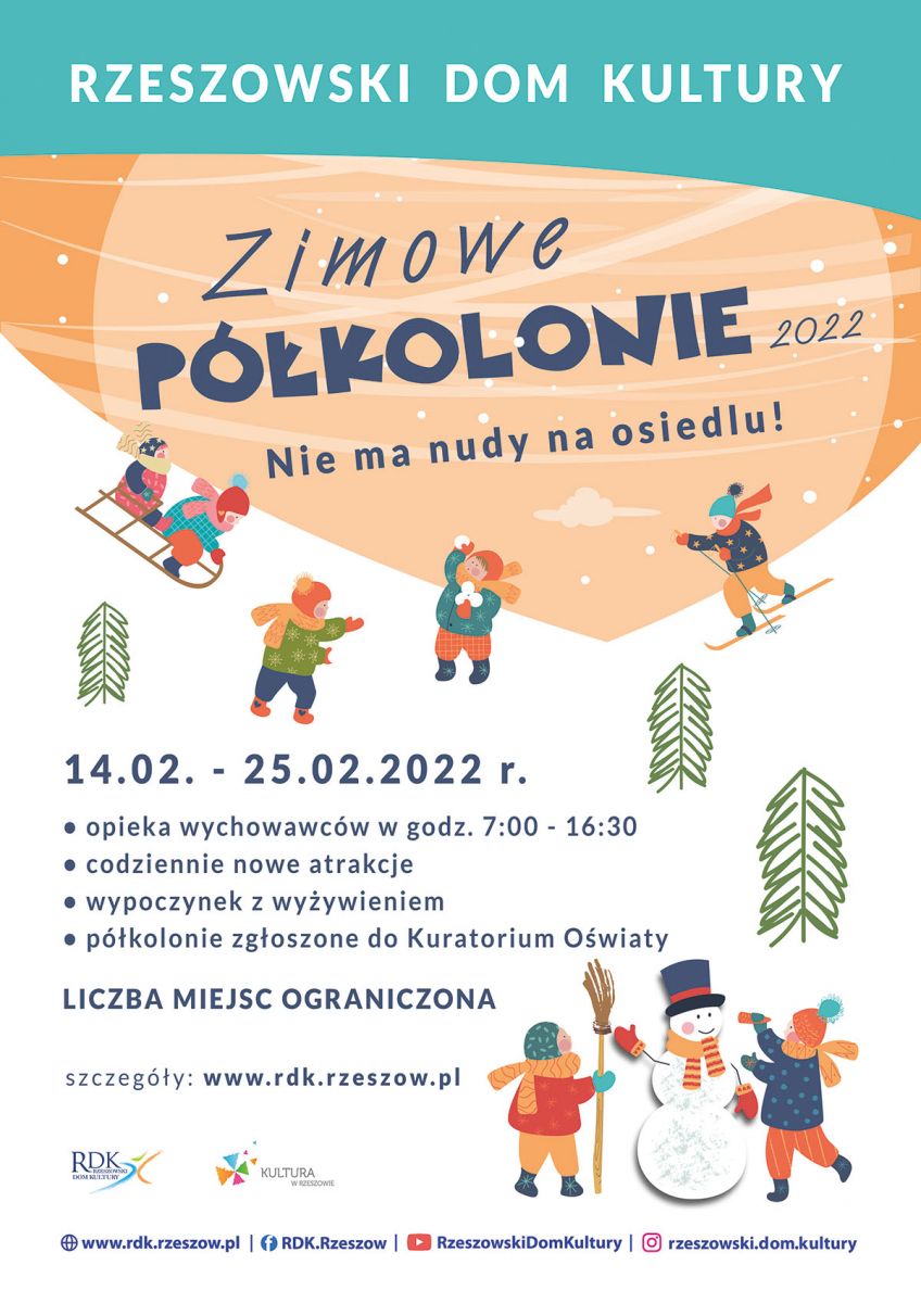 Rzeszowski Dom Kultury zaprasza dzieci do udziału w zimowych półkoloniach, które odbędą się w terminie od 14 lutego do 25 lutego 2022 roku w jedenastu filiach na terenie całego miasta. Przygotowane atrakcje i ruch na świeżym powietrzu pozwolą odreagować uczestnikom długie miesiące wytężonej nauki szkolnej oraz wzmocnić ich odporność. Liczba dostępnych miejsc jest ograniczona, a zapisy wystartują w dniu 10 stycznia 2022 roku.