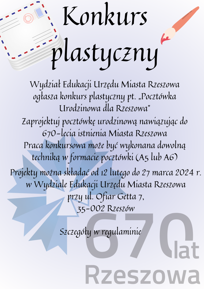 - Praca konkursowa polega na przygotowaniu projektu pocztówki urodzinowej dla Miasta Rzeszowa.